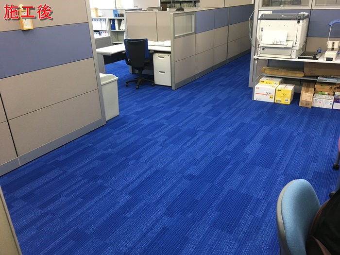 さて今回の施工紹介ですが今回も海物語でいきます。確変しますよ(笑) 先ずは施工写真からどうぞ既存はグレー色の市松貼で所々ハガレも生じお疲れな感じでした。今まさに貼替時な感じですね。今回は在室施工なのでデスクやお荷物を移動し貼替ます。その際この写真にあるローパーテンションが重く大きいので非常に苦労しました(´;ω;`)ウゥゥ。ただ既存カーペットのハガシは容易だったので助かりましたホッ