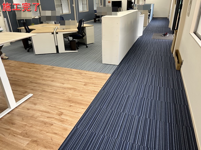 工事日:2023.1.14場所:東京都青梅市広さ:167㎡既存床材料:タイルカーペット ライトグレー.ピンク他デザイン貼り市松新規床材料:タイルカーペット ライトグレー.ブルーストライプ柄.流し貼 材料名 東リGA-100W 品名GA1763W(ライトグレー)GA1762W(ブルー) 木目レイフラットタイル 材料名 タジマLF-3520施工人数:5名 施工時間:6時間用途:事務所