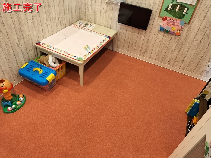 工事日:2024.7.23施工場所:千葉県千葉市美浜区 デンタルクリニック キッズスペース施工床面積:10㎡既存床材料:タイルカーペット400角 ライトブルー色 無地 市松貼新規床材料:タイルカーペット500角 オレンジ色 無地 市松貼 材料名 東リGA-400 品名GA4025施工:1名施工時間:2時間