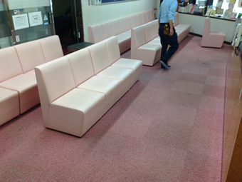 すでに8年ほどご利用頂いております。今までは無地の材料のご指定でしたが、今回は東リGA100Wシャドウブロックをご利用頂きました。女性の目はたいへん厳しいので、院長先生はいつも清潔な病院にされており年1回の張替えのご依頼を頂いております。